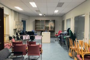Net als veel van het skelet, krijgt ook het interieur van het te slopen W&N-gebouw een tweede leven. Geïnteresseerden konden deze week stoelen en tafels reserveren voor wat praktische nostalgie in eigen huis.
