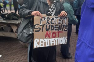 De studentenvakbond SRVU hield vandaag, donderdag 12 februari, op het campusplein een protestactie tegen de sociale onveiligheid op de VU.