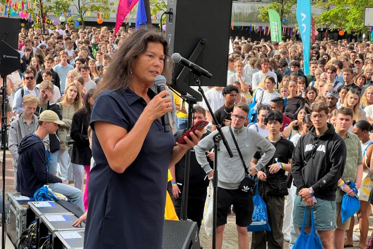 “Als ik al die mensen hier zie, met blond, bruin, zwart en blauw haar, al die verschillende achtergronden, die diversiteit, daar word ik blij van”, zei Chief Education Officer Jacqueline van Muijlwijk net tegen de massa eerstejaars op het campusplein. Ze sprak in het Engels en begon met een persoonlijke anekdote. “Toen ik mijn studie startte, met mijn gekleurde huid en afkomstig uit een arbeidersgezin, had ik geen voorbeelden om me heen van mensen die een universitaire studie hadden gedaan. Ik voelde me onzeker, wist niet wat ik kon verwachten en jullie hebben dat nu waarschijnlijk ook.”