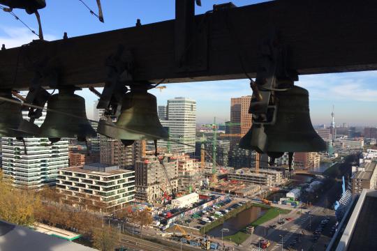 Dat terugzetten van het carillon op het dak van het hoofdgebouw was nog een hele onderneming. Afgelopen zaterdag, 12 november, stonden Dennis Bleijswijk, projectleider vastgoedbeheer aan de VU, en collega Alex Ursem al om zes uur ’s morgens klaar om de kranen te verwelkomen. Twee kranen, want de één was nodig om de andere (van 83 meter hoog, een van de hoogste van Nederland) in elkaar te zetten. Dat alleen al duurde uren. Van tevoren hadden de VU-mannen uiteraard alle gevaren in kaart gebracht en de vergunningen geregeld. Tijdens het hijsen zelf was het hun taak om in de gaten te houden of niemand zich in de afgezette gebieden in het hoofdgebouw bevond. Want als zo’n klokkenspel van 5,5 ton naar beneden valt, gaat hij dwars door drie verdiepingen…