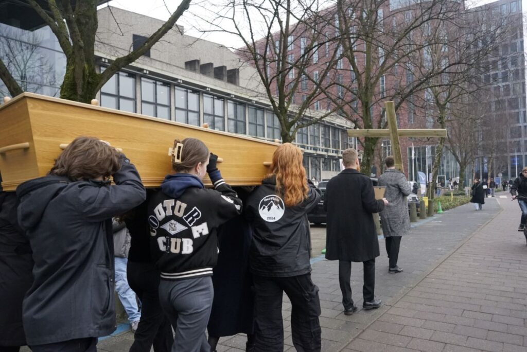 ‘Gaan we nou nog een doodskist halen?’, had Tuinman die ochtend aan Van der Hoek geappt. De donderdag erna stond een uitvaartdienst voor Aardwetenschappen gepland, als protest tegen de dreigende opheffing van de afdeling. Het zou mooi zijn als ze dan een echte grafkist hadden, hadden de studenten bedacht. Maar waar vind je die? Op Marktplaats dus. “Er staan niet zoveel echte grafkisten op Marktplaats”, vertelt Van der Hoek, “misschien een stuk of tien.”