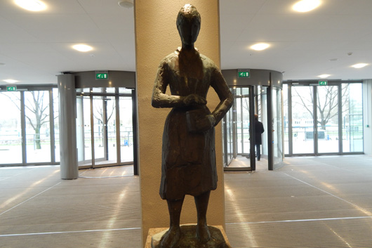 In 2012 zag niemand haar meer, toen werd ze ergens in een depot gezet, en nu is ze het middelpunt van de VU-campus, in de ontvangsthal van het VU-hoofdgebouw: de VU-Spaarster van beeldhouwer Pieter de Monchy (1916-2011).
