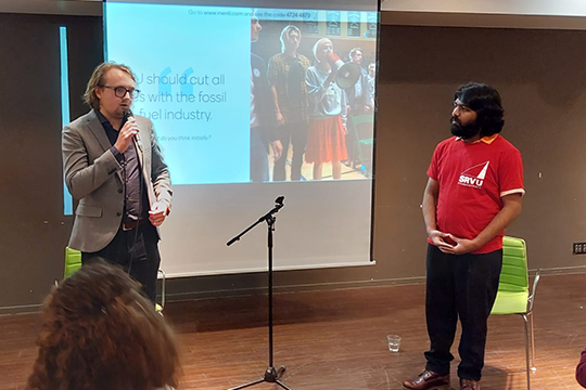 Another new party is the Liberale Universiteitspartij (liberal university party). Its sole member, Hidde Smid, took on the next topic of fossil fuel ties against SRVU’s Suvarn Nagan. Smid calls it naive to think the university should cut ties with fossil fuel companies. “If you want to improve the world, you have to interact with it and not stay in a bubble.” But Nagan believes that by continuing to work with the fossil fuel companies, the university inadvertently becomes closer to them and important changes are compromised. “Taking the brave act to cut ties with them shows that we will not tolerate their unethical existence.”