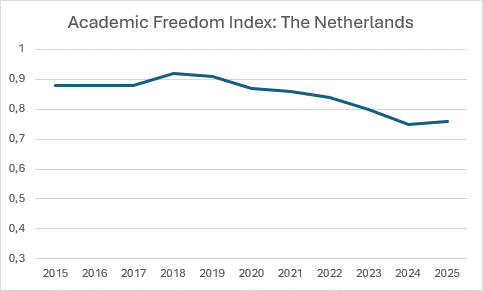 Last year, the Royal Netherlands Academy of Arts and Sciences (KNAW) also warned that academic freedom was under pressure in the Netherlands, partly due to the Schoof government’s far-reaching budget cuts and the ‘polarisation and the hardening of public discourse’. The KNAW also noted the Netherlands’ declining score on the Academic Freedom Index.