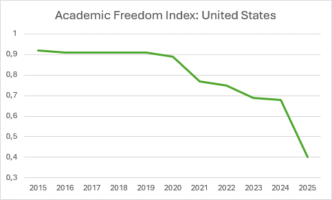 The most dramatic decline can be seen in the United States, where academic freedom has plummeted by a whopping fifty percent. Its current score of 0.40 suggests that there is currently less academic freedom in America than there was in the Netherlands during World War II.