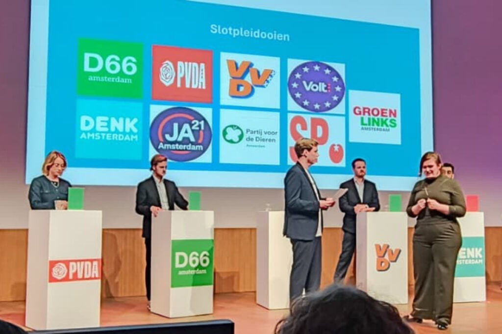 Volgens JA21 kun je 1.000 euro per maand verdienen en GroenLinks deelde gratis condooms uit. Dit verkiezingsdebat voor ruim 150 mensen werd live gestreamd door Het Parool. Via drie stellingen hebben ze het over bestaanszekerheid, wonen en veiligheid.