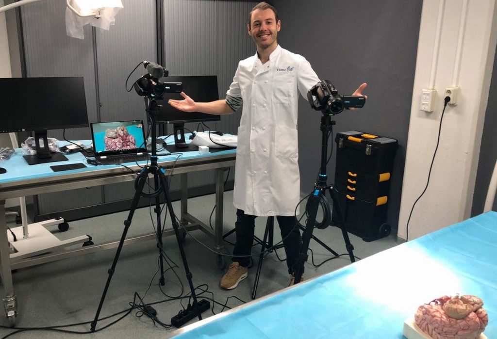 Gelukkig was anatomiedocent Alexander Bijnsdorp al langer bezig met het moderniseren van zijn onderwijs, hij deed al dingen met filmpjes en apps, en nu kwam er ook ineens wat geld beschikbaar. Daarvan bouwde hij een kleine studio. Hij schafte een paar camera’s aan en onder meer een statief waarmee je een snijsessie van bovenaf kunt filmen.