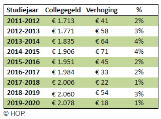 Voor studiejaar 2019-2020 stijgt het wettelijke collegegeld met 18 euro. Het is de kleinste sprong in jaren, nu het tarief niet langer omhoog hoeft voor de hogere salarissen van leraren.