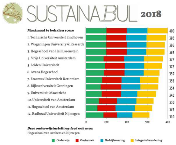 De SustainaBul 2018 is in Eindhoven bekendgemaakt op de Nationale Dag voor Duurzaamheid in het hoger onderwijs. De onderwijsinstellingen konden punten scoren op vier thema’s: onderwijs, onderzoek, bedrijfsvoering en ‘integrale benadering’.
