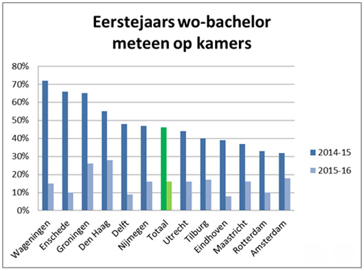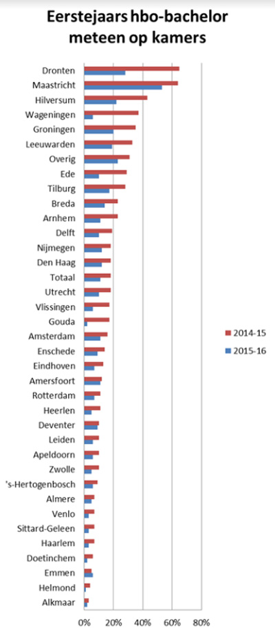 Bij de Universiteit Twente in Enschede wekken de cijfers eveneens verbazing. Volgens Kences zou daar nog maar tien procent van de eerstejaars meteen op kamers gaan, maar een student van een studievereniging denkt dat het niet klopt. “Wij hebben niet de indruk dat er iets veranderd is. Studenten willen toch wel in de stad wonen en de meesten zouden veel te ver moeten reizen.”