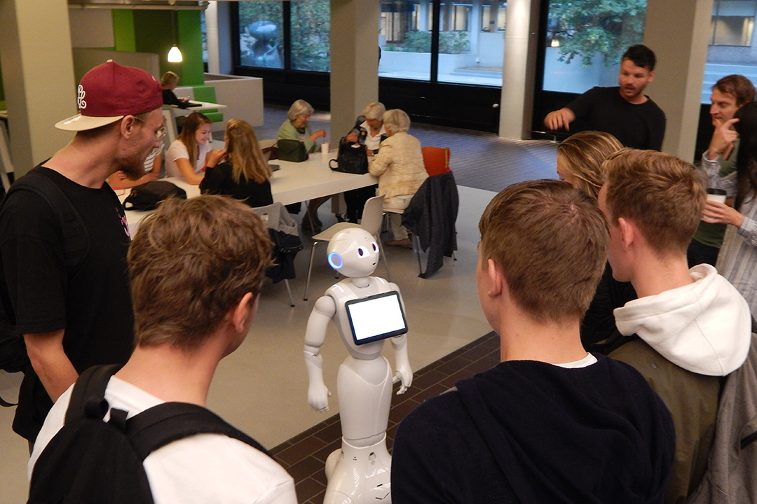 In de rij bij het koffiepunt in de centrale hal stond vanochtend een vreemde verschijning tussen de wachtenden: Pepper, een sociale robot. Studenten van de master communicatiewetenschap keken van een afstandje toe hoe mensen op de robot reageerden.
